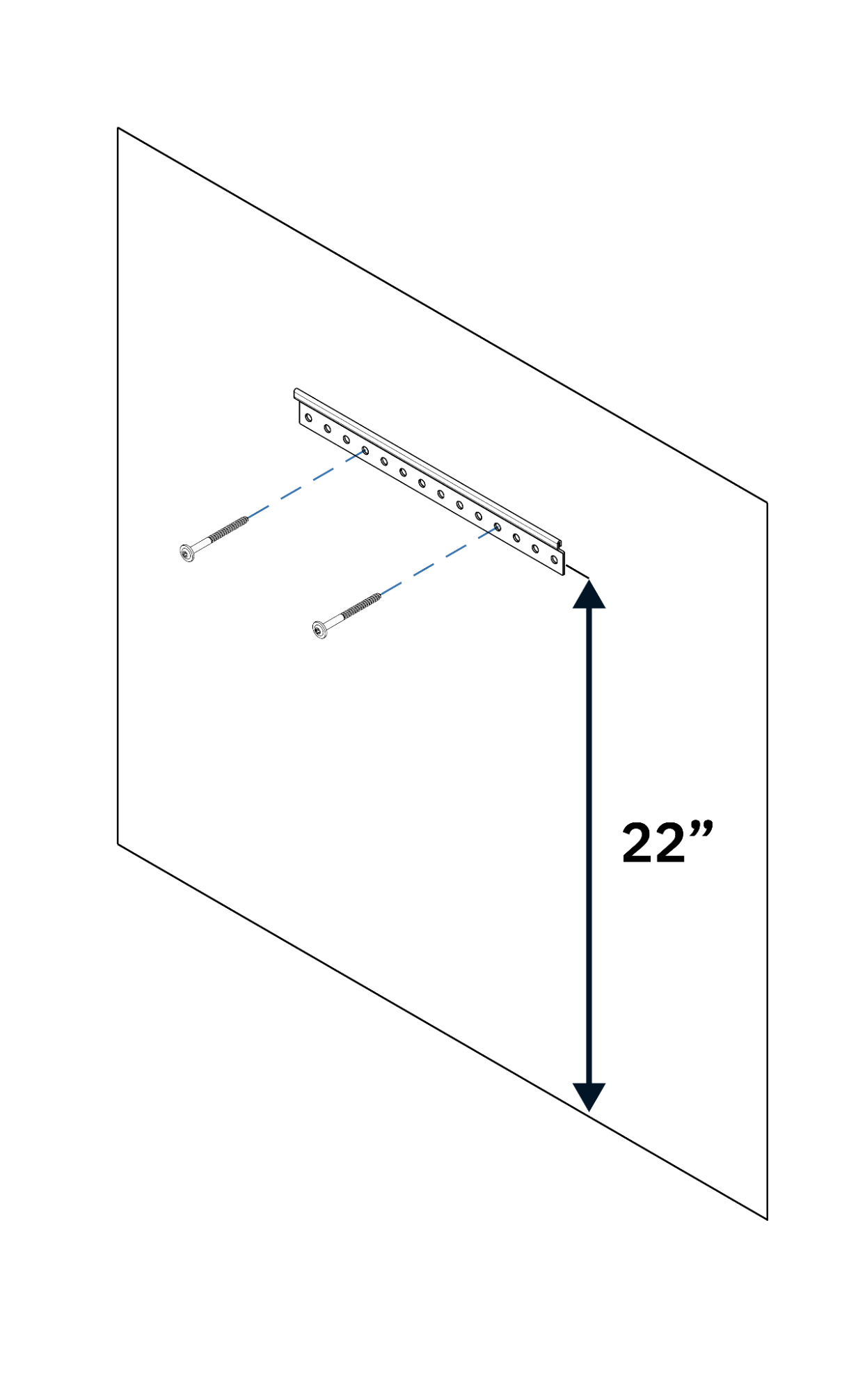 Dry fit bracket over stud. Mark wall at bottom of Bridge, then measure up 22” to position bracket.